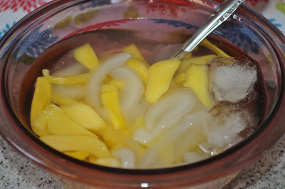 Okay, oftentimes I craved for the food I used to ate growing up in the Philippines. While shopping at an Asian store I found this can of jackfruit and young coconut. A thought came to me. So when I arrived home I opened the can and voila I had fresh jackfruit and young coconut. I added ice cubes to make it chilly and eat it right away.